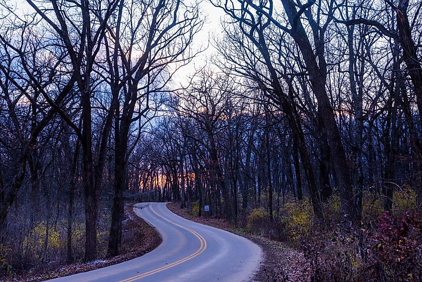 Um pôr do sol sereno sobre uma estrada sinuosa que atravessa o Parque Estadual New Glarus Woods, em Wisconsin.