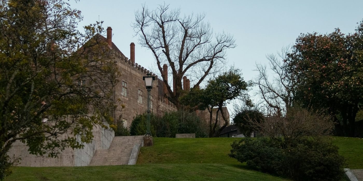 Un grand bâtiment en brique situé sur un champ vert à Guimarães, Portugal