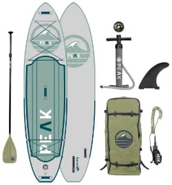 Idéal pour tous les niveaux de compétence et toutes les conditions aquatiques, le Stand Up Paddle gonflable Peak Expedition est une excellente option pour le tourisme, la pêche, la plongée en apnée et le canotage récréatif. La planche de 238 litres mesure 11' x 2' 8" x 6" et pèse 19,5 livres. Il est fait d’un matériau PVC résistant aux perforations et léger. Le coussin de pont est doux, il est donc confortable pour une autre personne ou votre chien, et la planche peut supporter jusqu'à 275 livres. Les cordons élastiques avant et arrière sécurisent votre équipement en toute sécurité. Avec cette planche, vous obtiendrez également une pagaie réglable en trois parties en aluminium, un leash de cheville à spirale, une pompe, une aileron amovible, un kit de patch, un étui étanche pour votre téléphone et un sac de transport. La planche de stand up paddle gonflable Peak Expedition est un choix de haute qualité pour la pagaie en eau calme.
