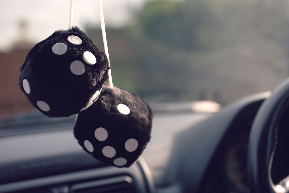 Dés à fourrure suspendus dans une voiture devant le pare-brise