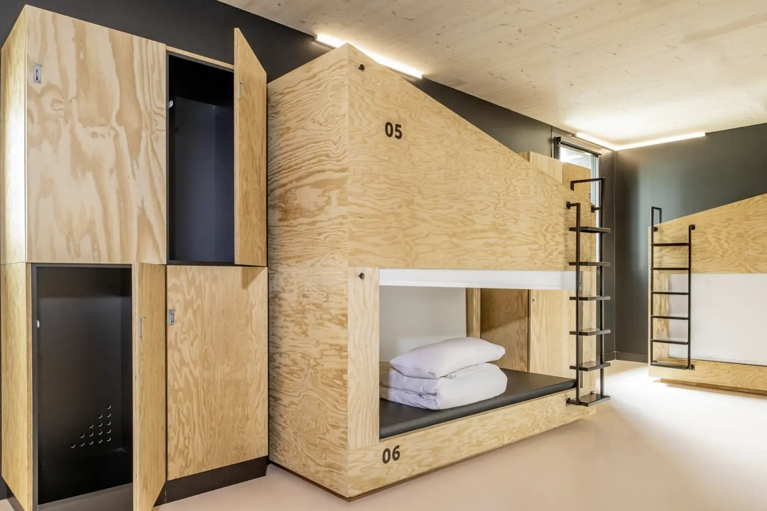 Des dortoirs pour quatre et six personnes sont disponibles, et chaque lit superposé est spécialement conçu en forme de « L » pour maximiser l'espace personnel et le stockage. Chaque coin lit dispose d'un rideau, d'un casier, d'une lampe de lecture et d'une prise électrique. Des chambres privées sont également proposées, pouvant accueillir jusqu'à six personnes.