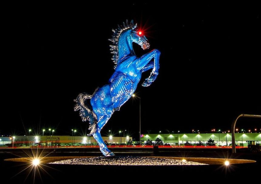 Bien que la Blue Mustang soit un symbole de fierté au DEN, son côté sombre laisse croire que la sculpture est maudite. Luis Jiménez, l'homme qui a créé le cheval, est malheureusement décédé en 2006 lorsqu'une partie de celui-ci s'est effondrée. Cela lui a sectionné une artère de la jambe et il s'est saigné à mort. On ne sait pas exactement pourquoi Jiménez a décidé de créer la Mustang en premier lieu.