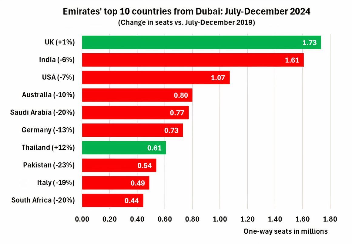 L'analyse des données fournies par la compagnie aérienne à OAG indique que sonles avions de passagers desservent 75 paysdepuis son hub de Dubaï entreJuillet et décembre 2024(la seconde moitié de l'année).