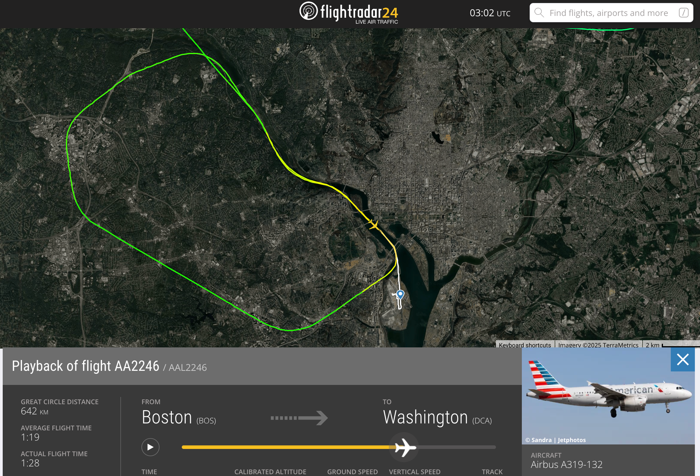 était en approche finale à l'aéroport national de Regan vers 8h30, heure locale, lorsqu'un contrôleur aérien a dit aux pilotes du vol de (littéralement) faire le tour à la dernière minute, à seulement un mile de l'atterrissage sur la piste 19 en provenance du nord de la rivière Potomac. Pourquoi? Il y avait un autre vol d'American Airlines, un
