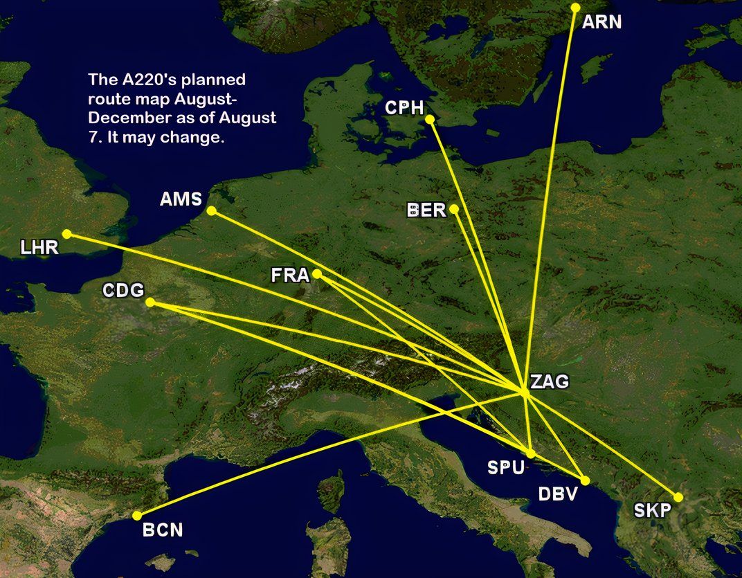 Le deuxième jour, le 7 août, le 9A-CAE a opéré Zagreb-Francfort-Split-Francfort-Zagreb. L’analyse du programme d’août de l’A220 montre qu’Amsterdam, Berlin, Londres Heathrow, Paris CDG et Skopje verront le nouvel avion, ne serait-ce qu’une seule fois. Le tour d’Heathrow sera le 12 août. Même si cela peut changer, le réseau de l’A220 jusqu’à fin 2024 est le suivant :
