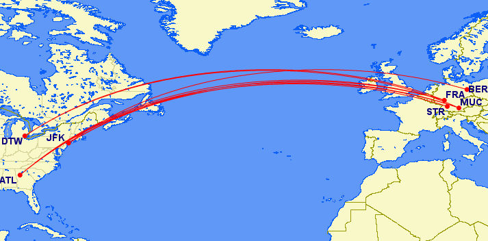 En comparaison, la compagnie aérienne effectue 117 départs hebdomadaires depuis AMS et son réseau de vols englobe huit destinations différentes aux États-Unis. Néanmoins, d'ici novembre, Delta Air Lines prévoit de desservir uniquement deux aéroports en Allemagne, l'aéroport de Francfort (FRA) et l'aéroport de Munich (MUC), avec 24 vols hebdomadaires vers ATL, l'aéroport métropolitain de Detroit Wayne County (DTW) et JFK.