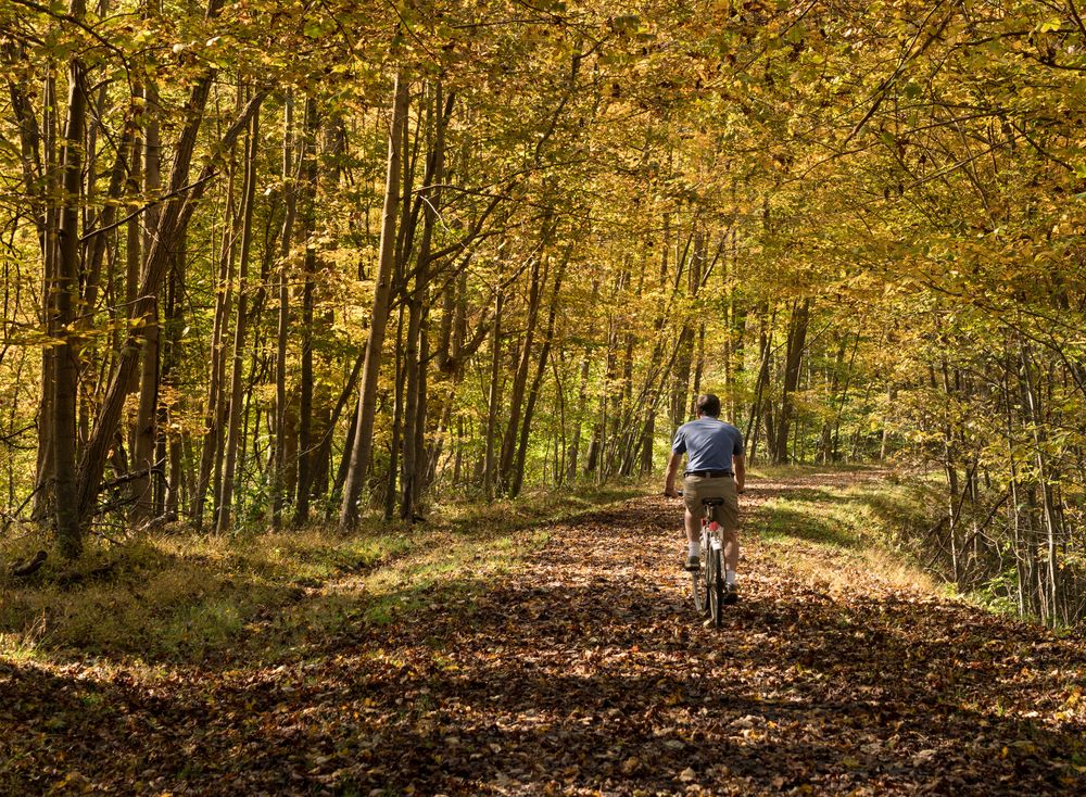 Un homme s'en va à vélo sur un sentier ferroviaire couvert de feuilles