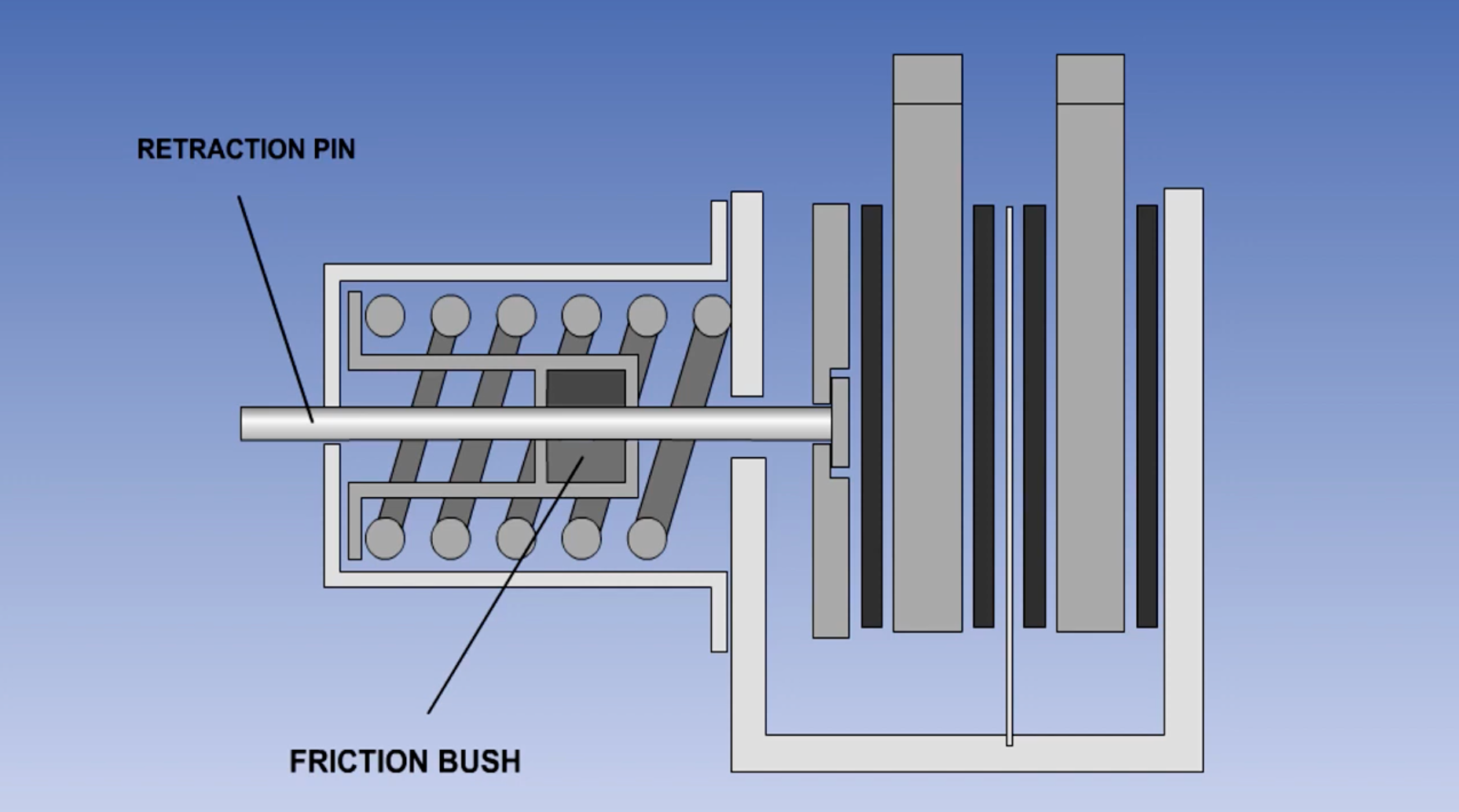 Lorsque les freins sont desserrés, la plaque de pression est écartée par un ensemble de réglage des freins. Il s'agit d'un dispositif à ressort fixé à la plaque. Lorsque les freins sont poussés, le ressort est comprimé et lorsqu'il est relâché, le ressort s'étend, déplaçant le plateau de pression. Cela libère les stators des rotors et le freinage n'existe plus.