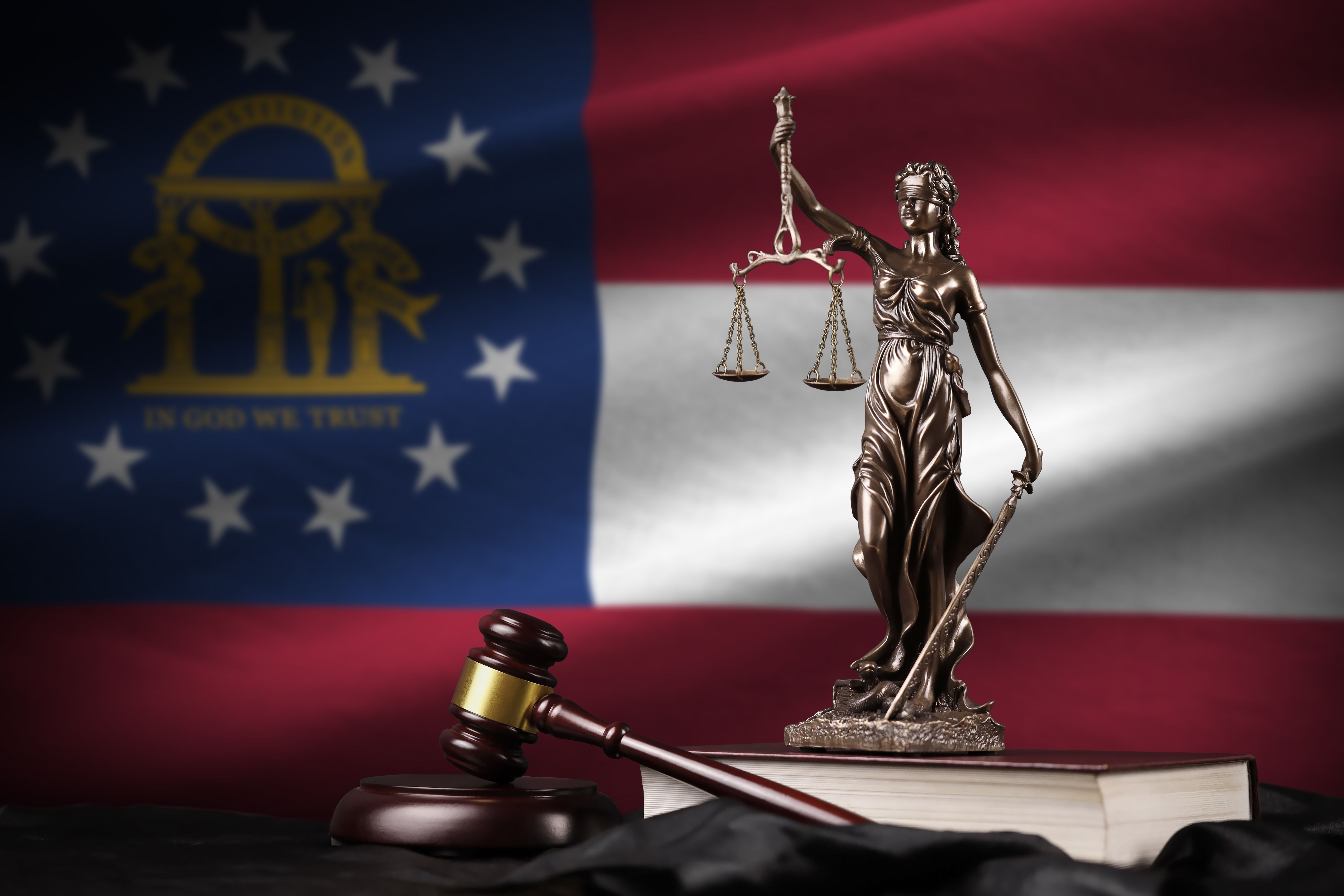 Drapeau de l'État américain de Géorgie avec statue de dame justice, constitution et marteau de juge sur draperie noire.
