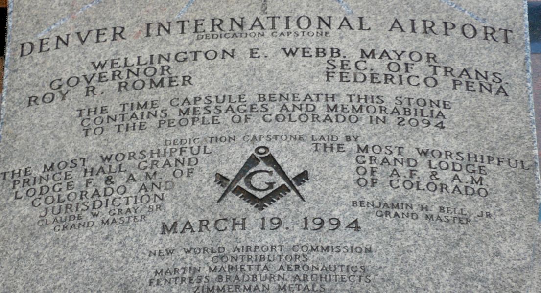 Un porte-parole de l'aéroport a déclaré dans le passé que les francs-maçons avaient créé la plaque et qu'ils avaient donc inclus le symbole. Cependant, aucune preuve n’a jamais été révélée que le groupe ait joué un rôle dans la gestion de l’aéroport. La formulation directe de la « New World Airport Commission » était censée faire référence à la Symphonie du Nouveau Monde de Dvorak, selonLe poste de Denver.