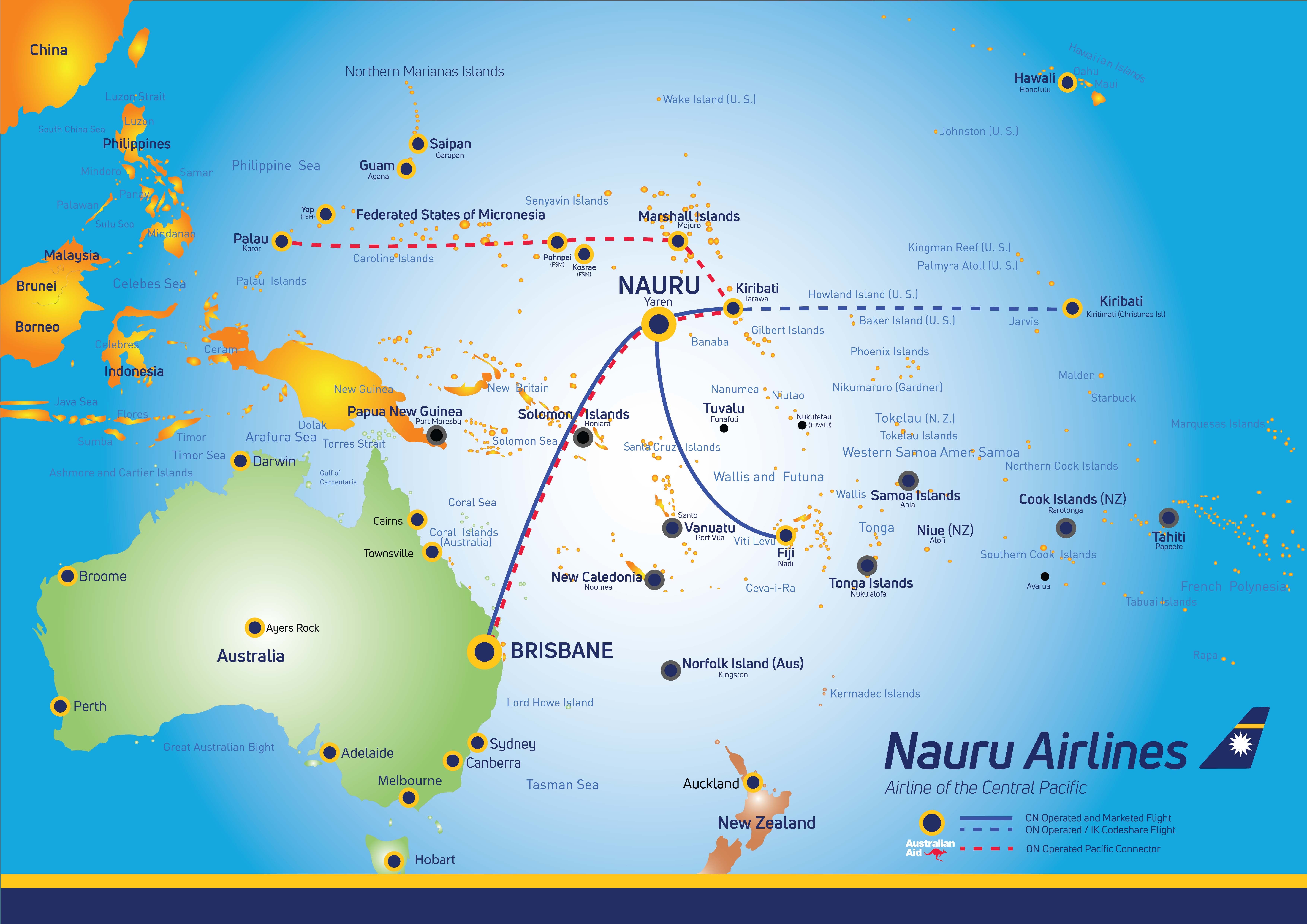 Le connecteur Australie-Pacifique Nord est un service hebdomadaire qui part de l'aéroport de Brisbane et se dirige vers Palau, un pays insulaire de plus de 500 îles dans la sous-région de Micronésie en Océanie dans le Pacifique occidental. En chemin, le 737 de Nauru Airlines s'arrête à Nauru, Tarawa, Majuro et Pohnpei.
