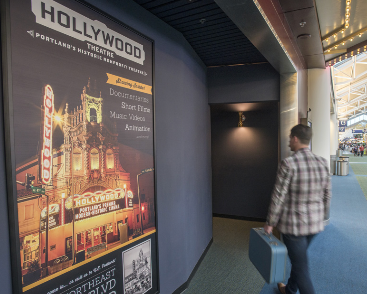 Le Hollywood Theatre divertit les voyageurs avec des courts métrages sur le nord-ouest du Pacifique. Il offre des opportunités de résidence aux artistes, invite à la collaboration entre artistes médiatiques et cinéastes locaux et organise des événements spéciaux. C'est gratuit pour les voyageurs. Les visiteurs peuvent regarder des films en attendant leur vol. Tous les films sont adaptés aux familles.