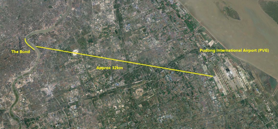 L’emplacement choisi pour l’aéroport de Pudong est à environ 32 kilomètres en ligne droite du centre-ville, la Place du Peuple. L'aéroport couvre une superficie de 44,4 kilomètres carrés.
