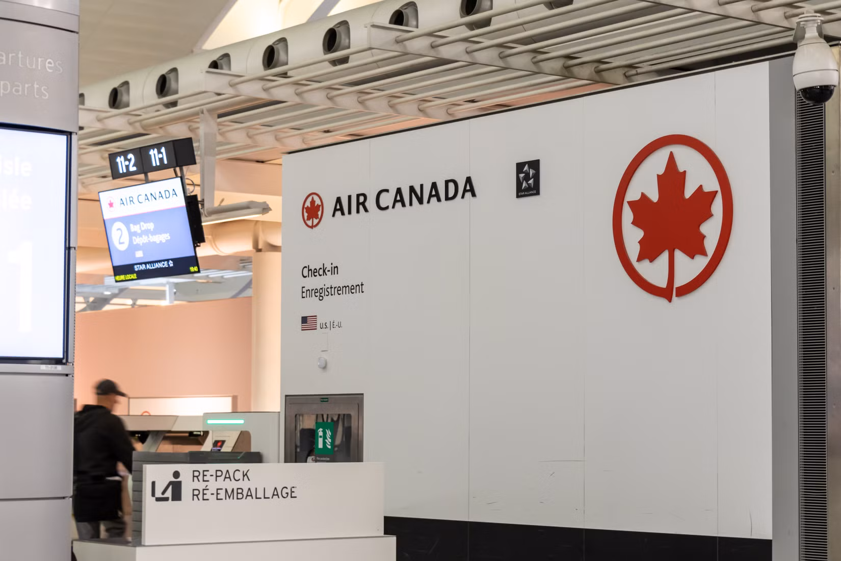Logo d'Air Canada au comptoir d'enregistrement et au kiosque de dépôt des bagages à l'intérieur de l'aéroport international Pearson de Toronto, terminal 1. Crédit : via Shutterstock