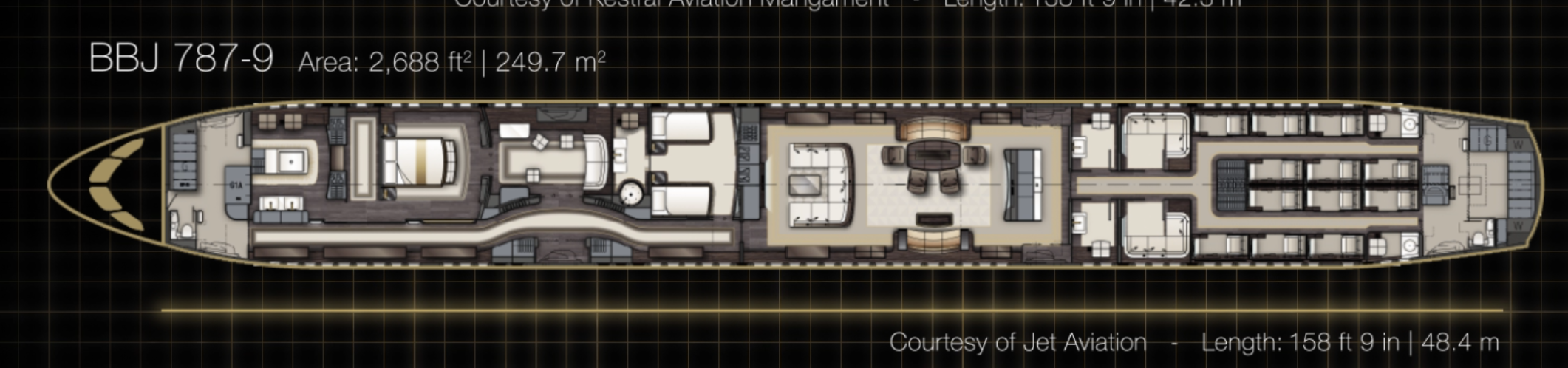 Le BBJ 787 est basé sur la famille d'avions commerciaux emblématique 787 Dreamliner. Avec sa structure composite et sa conception technologiquement avancée, le 787 BBJ offre des options longue distance aux clients privés. Le BBJ 787-8 est le plus petit de la famille, avec une longueur extérieure de 186 pieds. Alors que la version passagers peut accueillir environ 240 passagers, le BBJ 787-8 est généralement équipé de 25 à 50 personnes, selon les besoins des clients.