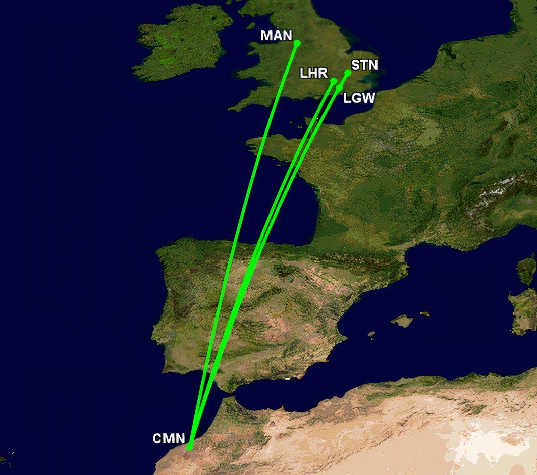 L'examen de chaque liaison entre le Royaume-Uni et le Maroc en juillet montre que Stansted a38 départs hebdomadaires. C'est le deuxième plus grand nombre, après Gatwick (48 par semaine). Royal Air Maroc dispose de trois des 38 vols, Jet2 de quatre et Ryanair de 31. Pour des raisons bilatérales, tous les services de Ryanair utilisent son unité britannique. La compagnie aérienne à très bas prix est la principale compagnie aérienne reliant le Royaume-Uni à ce pays d'Afrique du Nord.