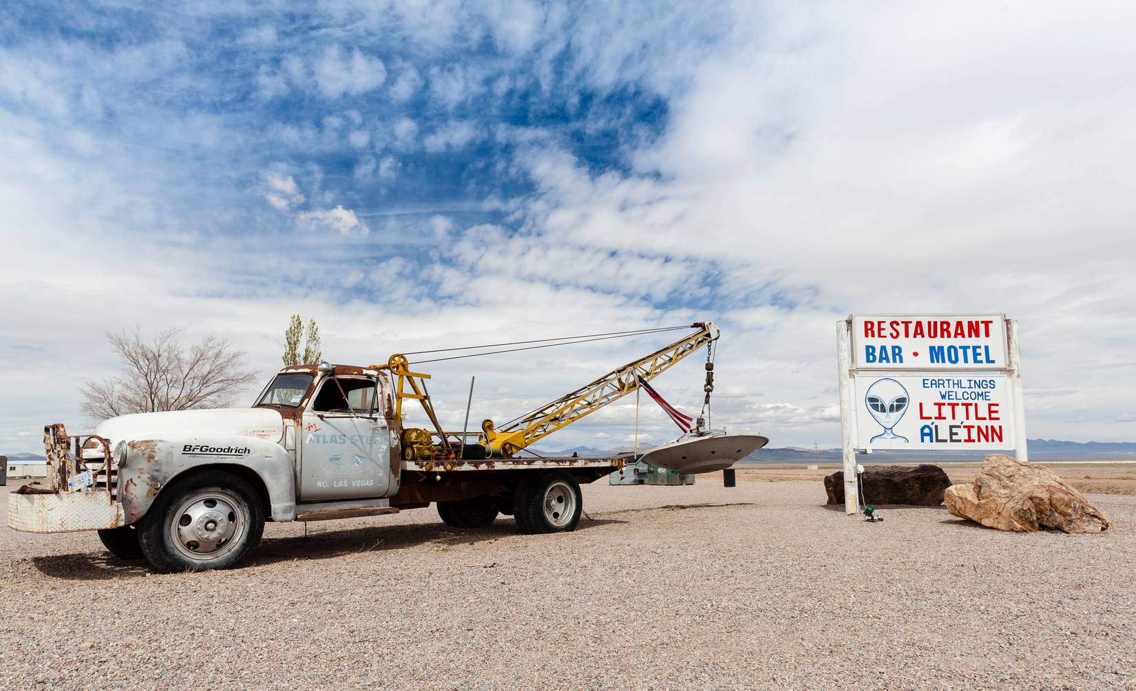 Little A'Le'Innest devenu la première attraction sur le thème des extraterrestres à Rachel, dans le Nevada, en 1991. Il s'agissait d'un restaurant anciennement nommé Rachel Bar & Grill, qui est maintenant un restaurant, un motel, un bar, une boutique de souvenirs, etc. C'était également le lieu de la première conférence sur les ovnis de la ville. Une statue d'extraterrestre verte tenant une pancarte « Bienvenue Terrien » vous accueille à l'entrée de l'établissement. Vous trouverez ensuite un menu thématique à l’intérieur proposant des plats délicieux comme le « World Famous Alien Burger », avec d’autres passionnés d’OVNIS et des habitants de la ville partageant des histoires d’observations et d’enlèvements inhabituels.