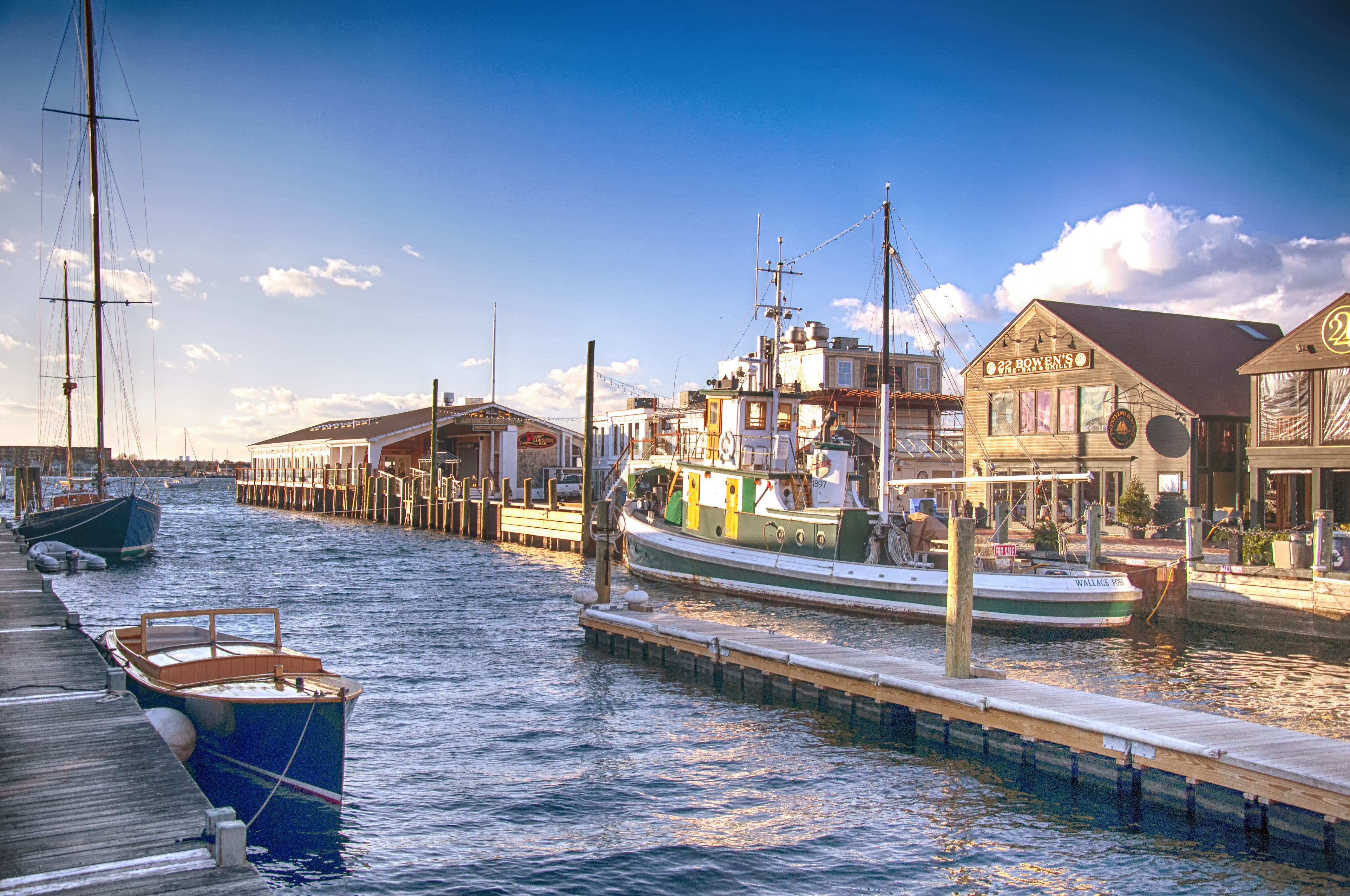 Une vue sur un port de Newport avec des boutiques et des bateaux au coucher du soleil, Rhode Island