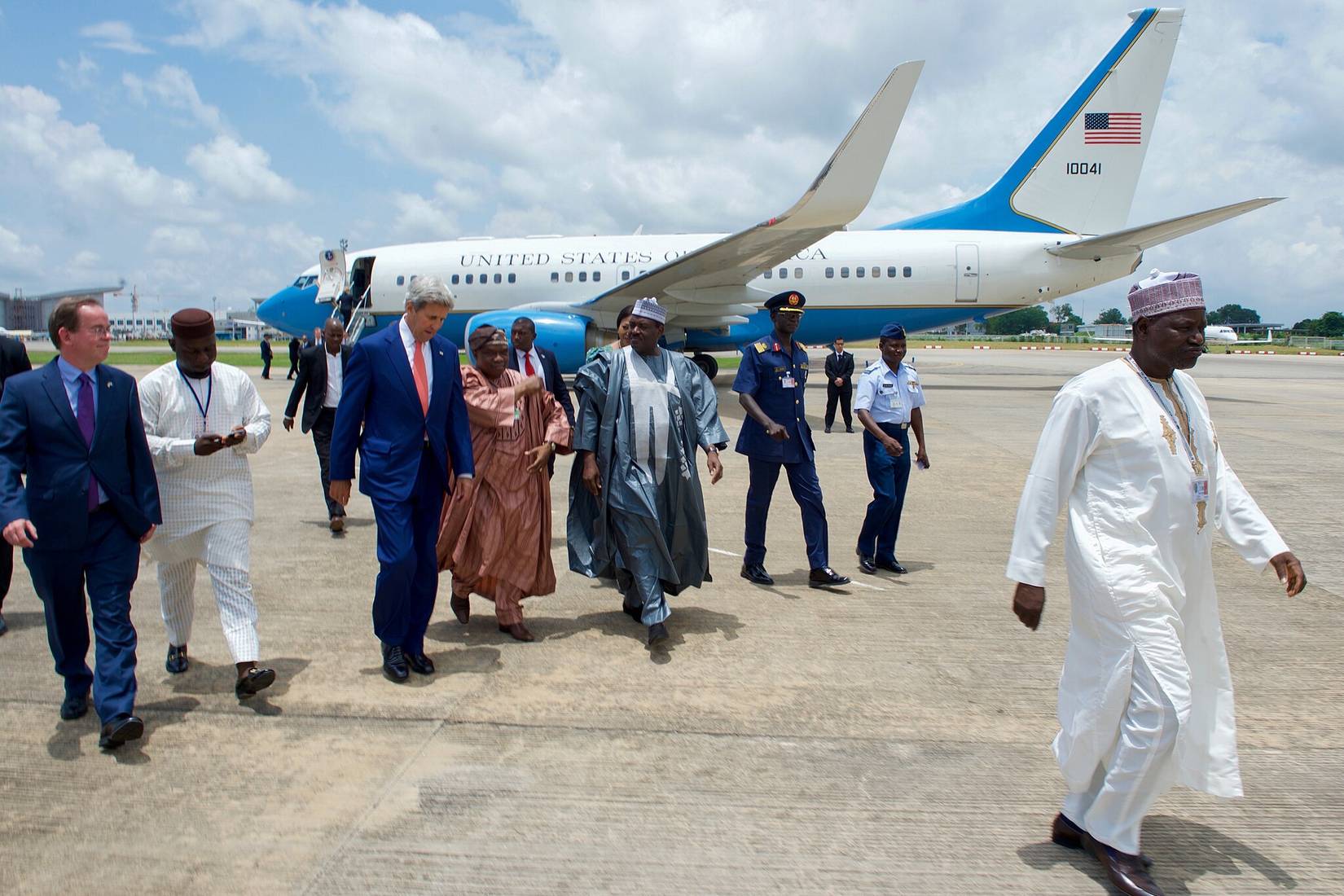 L'ancien secrétaire d'État américain John Kerry avec le chef de mission adjoint de l'ambassade américaine à Abuja, David Young, et des responsables du ministère nigérian des Affaires étrangères, le 23 août 2016, à l'aéroport international Nnamdi Azikiwe, à Abuja, au Nigéria.