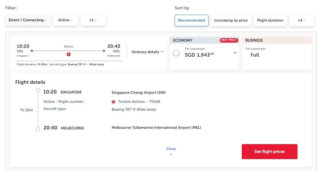 Ayant initialement prévu de débuter ses vols vers l'Australie entre le 15 et le 25 mars de cette année, le site de réservation de Turkish Airlines semble désormais avoir confirmé la date exacte du début. Comme l'a repéré YK Tan, lecteur aux yeux d'aigle de Simple Flying, les vols entre Singapour et Melbourne peuvent désormais être réservés à partir du 16 mars.Cliquez ici pour trouver des vols.
