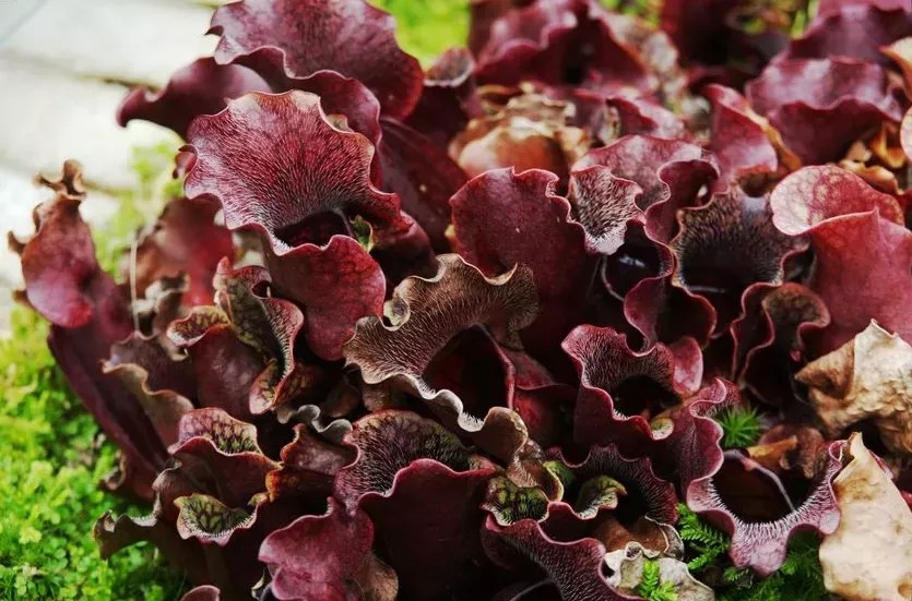 Les lys Cobra sont les plantes à pichet les plus difficiles, préférant le climat sec du nord de la Californie et du sud de l'Oregon. Cependant, les types les plus courants que vous verrez aux États-Unis sont les pichets violets (également appelés chaussettes de tortue) et les pichets Trump (ci-dessous).