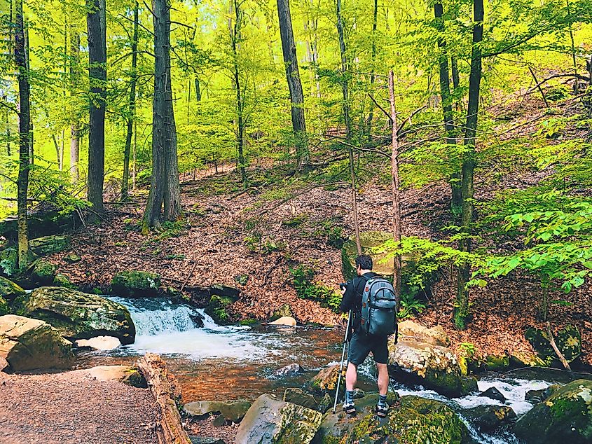 Un homme marchant à travers la forêt en direction des chutes Bushkill.