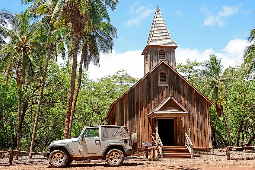 Une vieille église historique en bois entourée de palmiers sur l'île de Lāna'i à Hawai'i.