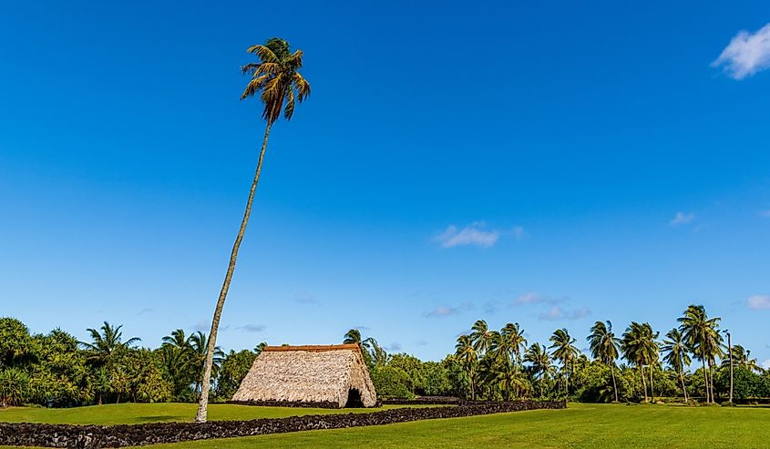Maison hawaïenne traditionnelle avec toit de chaume au milieu d'un paysage tropical de palmiers au jardin Kahanu, Hāna, Maui.