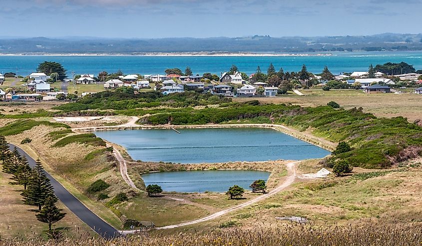 Réservoir d'eau douce, maisons et océan à Stanley. Crédit image Claudine Van Massenhove via Shutterstock