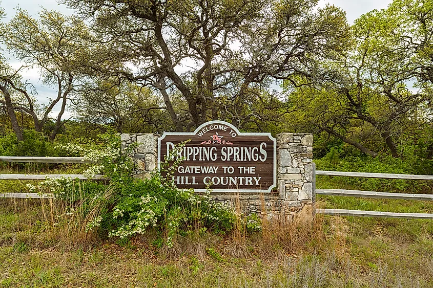 Dripping Springs, Texas États-Unis – 6 avril 2016 : Bienvenue au panneau Dripping Springs de cette petite ville du Texas Hill Country. Crédit photo éditorial : Fotoluminate LLC Shutterstock.