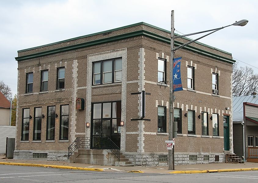 Bâtiment historique de la Holmen Bank à l'intersection des rues Main et State à Holmen, Wisconsin, par Jonathunder – Travail personnel, GFDL 1.2, Wikimedia Commons