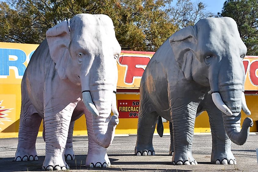 Originaire de l'Alabama, le propriétaire de Papa Joe's Fireworks (où les éléphants étaient assis jusqu'en 2022) les a fait expédier à Hardeeville en 1974 pour les asseoir sur le parking de son magasin. Il peut être difficile de prendre un selfie avec Thelma et Louise (ou Big Al et Lizzy, si vous voulez utiliser leurs « vrais » noms) en raison de leur taille massive. Si vous voulez essayer, vous pouvez les trouver au Crazy Joe's Fireworks sur Hummingbird Lane à Hardeeville.