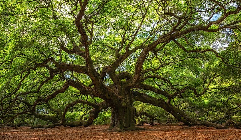 Trouvé sur l'île Johns près de Charleston, l'Angel Oak, également connu sous le nom de Southern Live Oak, est un chêne vieux de 500 ans qui mesure 65 pieds de haut et 25,5 pieds de diamètre. Il était présent en 1717 lors d'une concession de terre et l'arbre fut légalement noté. L'arbre, qui offre 17 000 pieds carrés d'ombre, reçoit près d'un demi-million de visiteurs chaque année.