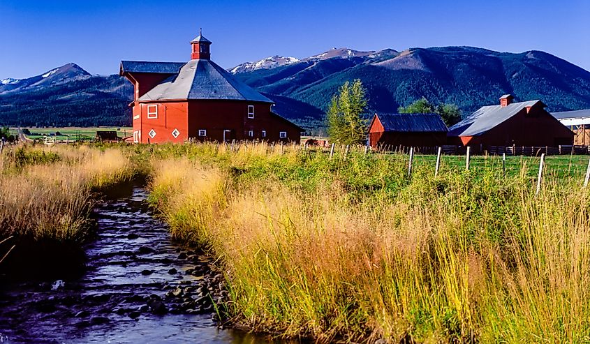 Grange octogonale rouge et ronde dans une ferme près de Joseph, Oregon.