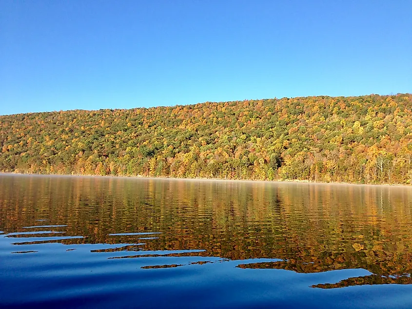 L'eau claire et calme du lac Canadice, l'un des Finger Lakes de New York, en automne, avec un ciel bleu en arrière-plan.