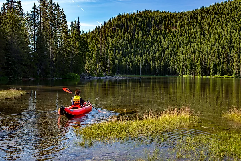 Un homme faisant du kayak dans le lac du Diable près de Bend, Oregon. Crédit éditorial : Bob Pool / Shutterstock.com