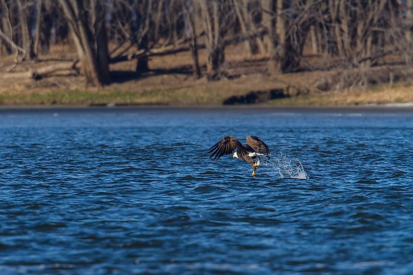 Un pygargue à tête blanche américain pêchant dans la rivière qui passe devant Le Claire, Iowa.