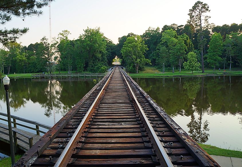 Des voies ferrées historiques traversant un lac à Thomasville, en Géorgie.