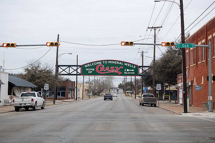 Un panneau sur une route à Mineral Wells Texas qui indique Bienvenue à Mineral Wells Home of Crazy, via jmanaugh3 / Shutterstock.com