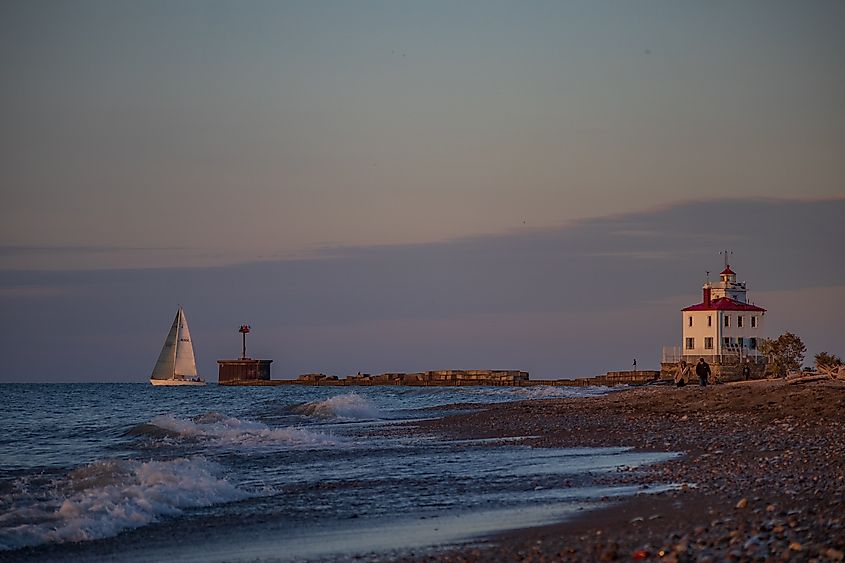 Des eaux de lac agitées et un couple se promenant le long de la plage de Fairpoint Harbor, Ohio, avec Fairport Harbor West Breakwater Light au milieu et un voilier blanc recréant en arrière-plan.
