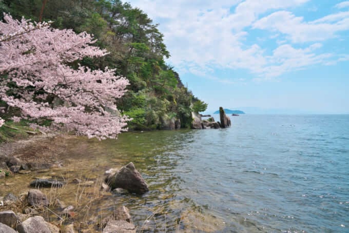 Au printemps, les cerisiers Someiyoshino fleurissent le long des rives du lac, créant une scène magnifique lorsqu'ils sont observés à travers les fleurs, attirant de nombreux visiteurs pour l'observation des cerisiers. À la fin du printemps, la verdure fraîche sur fond de lac Biwa offre un contraste rafraîchissant qui dissipe la brume persistante du mois de mai. Assurez-vous de visiter au moins une fois.