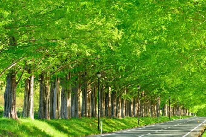 La « Zone d’aménagement paysager en bordure de route » est parfaite pour une promenade le long d’une rangée d’arbres métaséquoias.