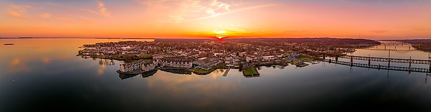 Panorama aérien du coucher du soleil sur Havre De Grace, comté de Harford, Maryland, États-Unis.