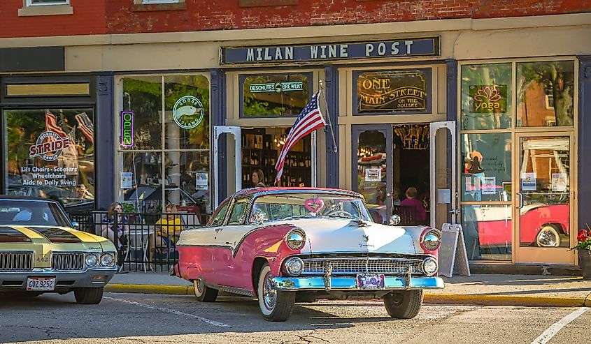 Une belle Ford rose est garée devant les magasins locaux à Milan, Ohio. Crédit image Keith J Finks via Shutterstock.com