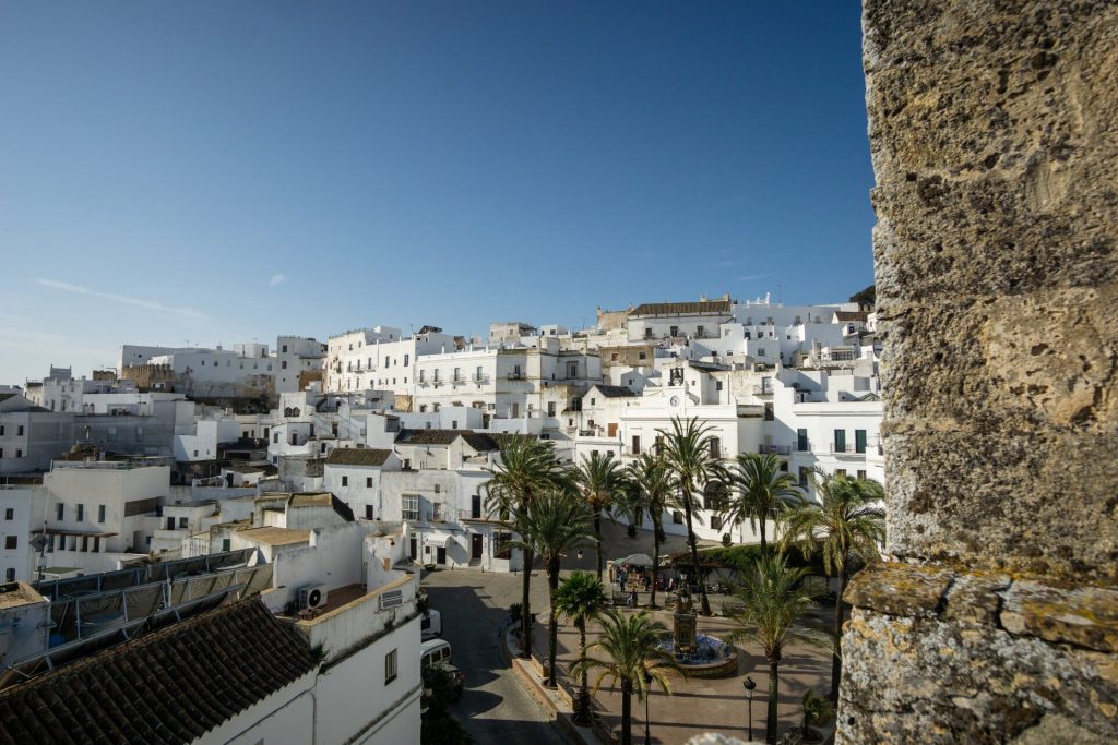 Arcos de la Frontera, une ville aux façades immaculées blanchies à la chaux et aux toits de tuiles, réside au sommet d'une falaise abrupte. Avec Vejer de la Frontera, elle est considérée comme faisant partie de la « Route des Villages Blancs », grâce à son style architectural distinctif.
