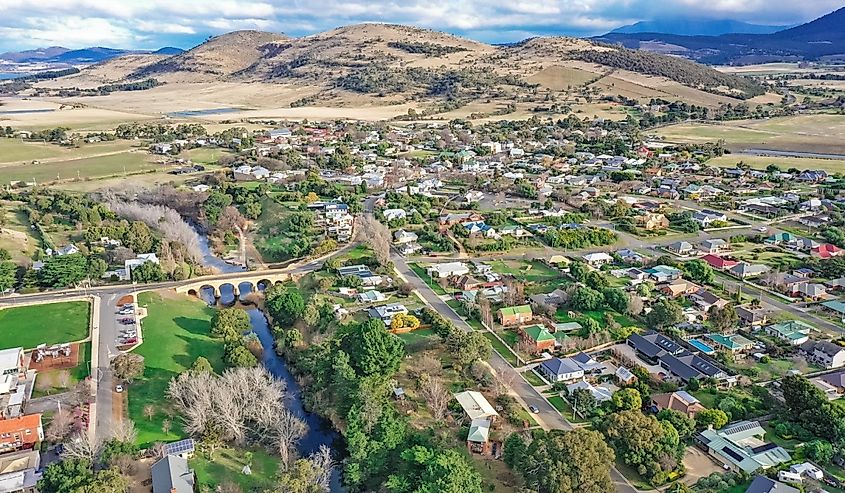 Vue aérienne du village historique de Richmond près de Hobart en Tasmanie, Australie. Crédit image Rachael Bowes via Shutterstock.