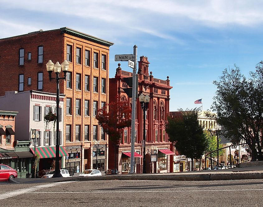 Market Street, dans le quartier de Gaffer, à Corning, dans l'État de New York, abrite des bâtiments du XIXe siècle bien conservés et des magasins intéressants. Crédit éditorial : Spiroview Inc / Shutterstock.com