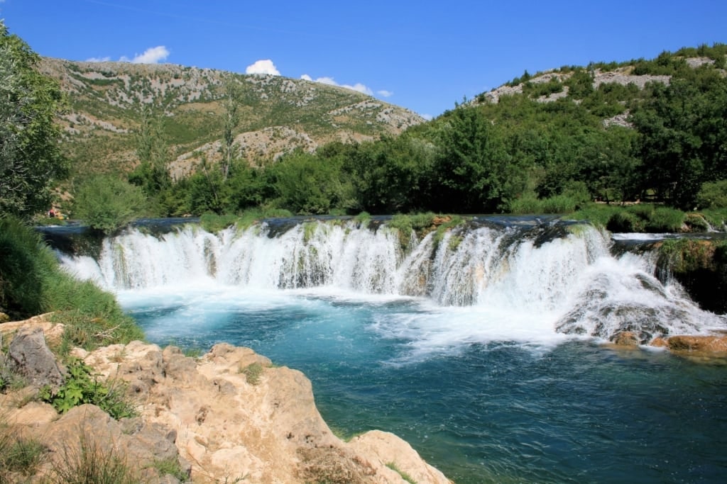 Dinara, la plus haute chaîne de montagnes de Croatie, se trouve à 26 km à l'est, ses ruisseaux et ses bassins alimentant cette cascade pittoresque.