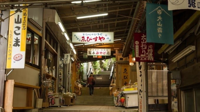 Le chemin de 700 mètres reliant le dernier arrêt de bus à la station de téléphérique d'Ōyama est connu sous le nom de « Koma Sando », une rue bordée de boutiques de souvenirs. Le long de cette approche étroite, vous trouverez des magasins vendant des spécialités locales telles que l'Ōyama koma (toupies) et le tofu. Le week-end et les jours fériés, la région regorge de touristes.