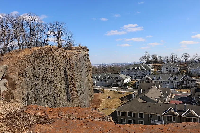 Vue sur une falaise et le complexe de copropriétés Four Seasons Great Notch depuis Rifle Camp Park. Par quiggyt4 / Shutterstock.com